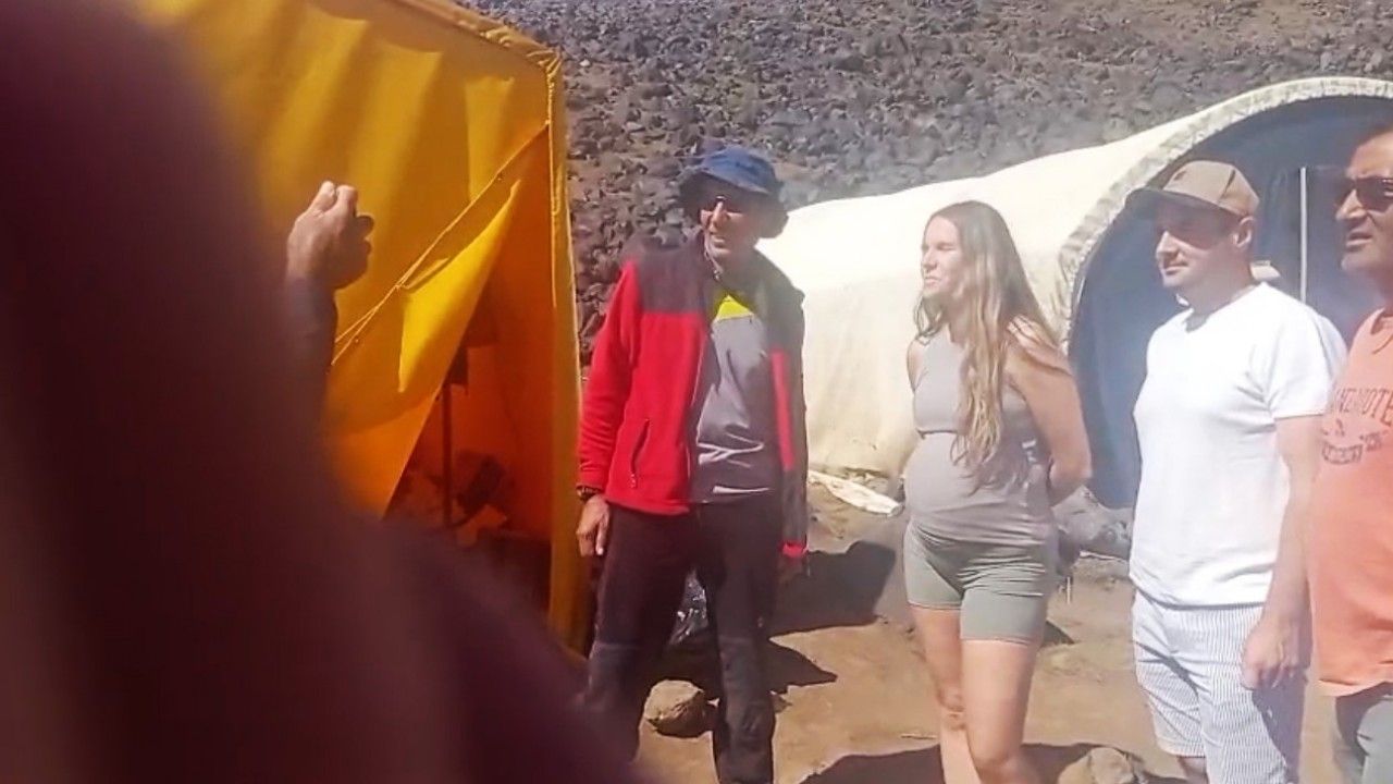 Hamileliğine rağmen profesyonel rehberler eşliğinde tırmanışa başlayan turistin bu cesareti dikkat çekti.
