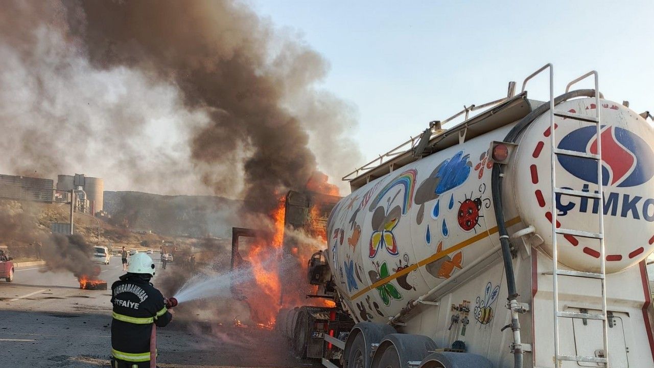 Kahramanmaraş’ta seyir halindeki harç yüklü kamyon yangın çıktı.