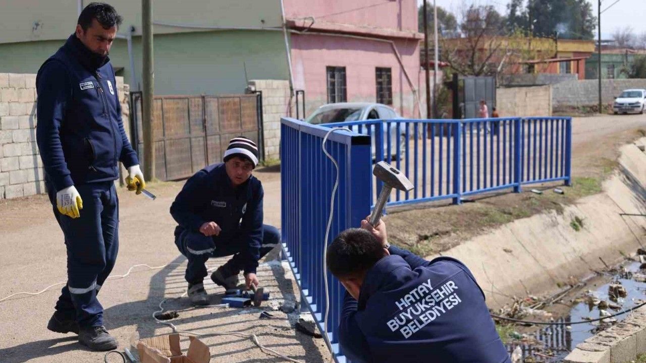 Hatay Büyükşehir Belediyesi (HBB) Ulaşım Dairesi Başkanlığı, il genelinde trafikte can ve mal güvenliğini sağlamak amacıyla riskli görülen kanal, yol, kaldırım, köprü ve menfezlerde koruma bariyerleri montajlarına devam ediyor. HBB ekipleri, Kırıkhan ilçesi Bahçelievler ve Camızkışlası Mahallelerinde trafik kazalarına neden olan açık kanallar ve yol kenarlarında korkuluk montajı yaparak olası can ve mal kayıplarının önüne geçti.
