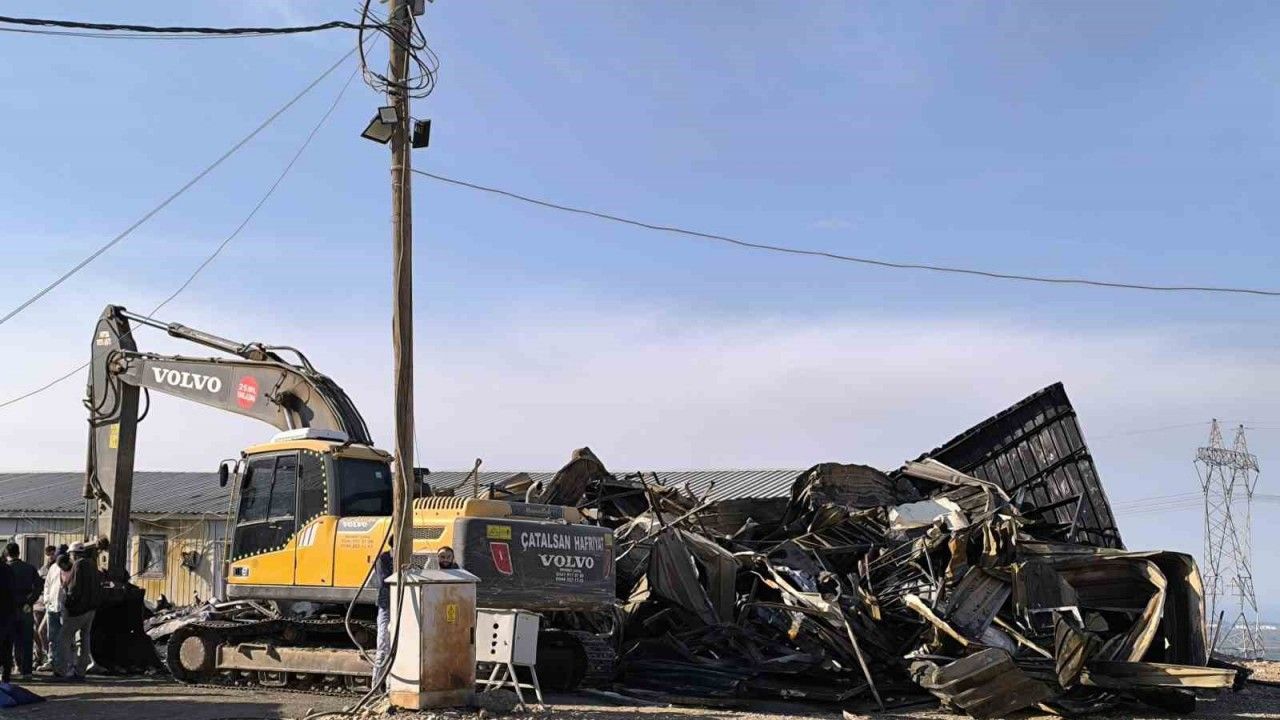 Hatay’da alevlere teslim olan şantiye alanındaki konteyner yatakhane kullanılmaz hale geldi.