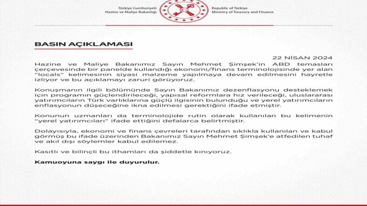 Hazine ve Maliye Bakanlığı, Bakan Mehmet Şimşek’in ABD temasları sırasında bir panelde kullandığı “locals” kelimesinin siyasi malzeme yapılmasını eleştirdi. Bakanlık tarafından yapılan yazılı açıklamada şu ifadelere yer verildi: “Hazine ve Maliye Bakanımız Sayın Mehmet Şimşek’in ABD temasları çerçevesinde bir panelde kullandığı ekonomi/finans terminolojisinde yer alan ‘locals’ kelimesinin siyasi malzeme yapılmaya devam edilmesini hayretle izliyor ve bu açıklamayı zaruri görüyoruz.