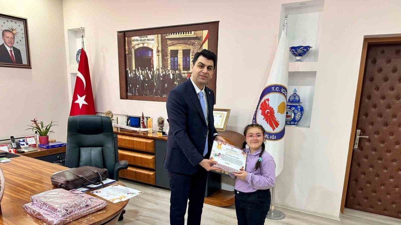 "Kütüphane Haftası" kitap okuma etkinlikleri çerçevesinde sene içinde İlçe Kütüphanesinden en çok kitap alıp okuyan Atatürk İlkokulundan Ummahan Nil Can, Cumhuriyet İlkokulundan Elif İkra Demir ve Şehitler Ortaokulundan Ayşenur Demir’i makamında kabul eden Kaymakam Muhammet Samet Bahar, öğrencilere başarı belgesi ve ödül takdim ederek başarılarının devamını diledi.