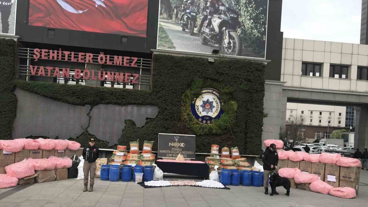İçişleri Bakanı Ali Yerlikaya tarafından sabah saatlerinde duyurulan uyuşturucu operasyonunda ele geçirilen maddeler İstanbul Emniyetinde sergilendi.