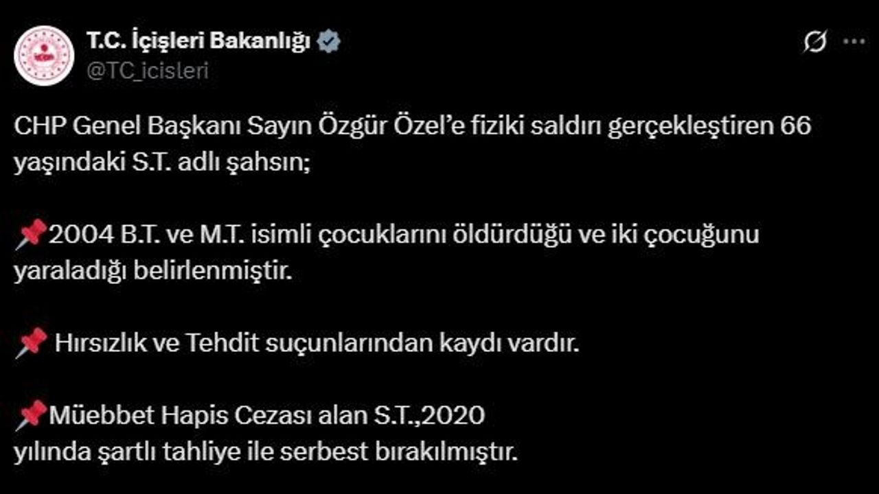 CHP Genel Başkanı Özgür Özel, TBMM Başkanvekili Sırrı Süreyya Önder için İstanbul’daki Atatürk Kültür Merkezi’nde düzenlenen törenin ardından saldırıya uğramıştı. İçişleri Bakanlığı’nın sosyal medya hesabından yapılan paylaşımda, Özel’e saldırıyı gerçekleştiren S.T. (66) adlı şahsın 2004 yılında B.T. ve M.T. isimli 2 çocuğunu öldürdüğü ve 2 çocuğunu da yaraladığı belirtildi. Bakanlığın paylaşımında, "Hırsızlık ve tehdit suçlarından kaydı vardır. Müebbet hapis cezası alan S.T., 2020 yılında şartlı tahliye ile serbest bırakılmıştır" ifadelerine yer verildi.