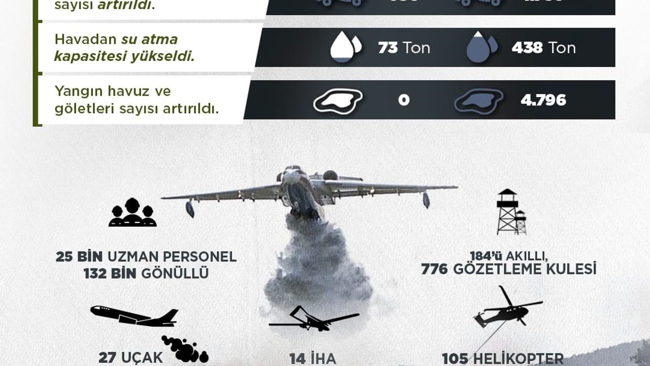 "Tüm dünyada gece yangın söndürme uçuşları, genellikle helikopterlerle çok sınırlı ölçüde yapılmaktadır. Çünkü etkisi sınırlı, riski ise oldukça yüksektir. Ülkemizde de bu uçuşlar, gündüz belirlenen güvenli rotalar üzerinde deneme ve geliştirme kapsamında gerçekleştirilmektedir. Her yıl ihtiyaçlar doğrultusunda personel ve ekipman sayımız artırılmakta, teknolojik gelişmeler titizlikle takip edilerek mücadele kapasitemize entegre edilmektedir. Teşkilatımız, yangınlara karşı her yıl düzenli olarak hazırlık ve önleyici çalışmalar yürütmektedir. Ölü ve diri örtü temizliği yapılmakta, yangın riskini azaltacak şekilde orman bakımı gerçekleştirilmektedir. ’BenimOrmanım’ kampanyası ile ormana atılan atıklar ve çöpler toplanarak farkındalık oluşturulmaktadır. Orman köylerinde eğitimler verilmekte, okullarda tiyatro gösterileri ile çocuklarda orman bilinci geliştirilmektedir. Yangın önleme şeritleri, orman yolları ve yangına dirençli orman projeleri hayata geçirilmektedir. Yangın söndürme havuz ve göleti sayıları arttırılmaktadır. Yangına dirençli türlerle ağaçlandırma çalışmaları yapılmaktadır. Orman yangınları konusunda taraflı ve yanıltıcı dezenformasyona itibar etmeyin. Vatandaşlarımızı bu alanda doğru bilgi edinmeye ve orman yangını gönüllüsü eğitimlerine katılarak mücadelemize destek vermeye davet ediyoruz. Yüzde 90’dan fazlası insan kaynaklı nedenlerle başlayan yangınları birlikte önleyebileceğimizi hatırlatıyoruz."