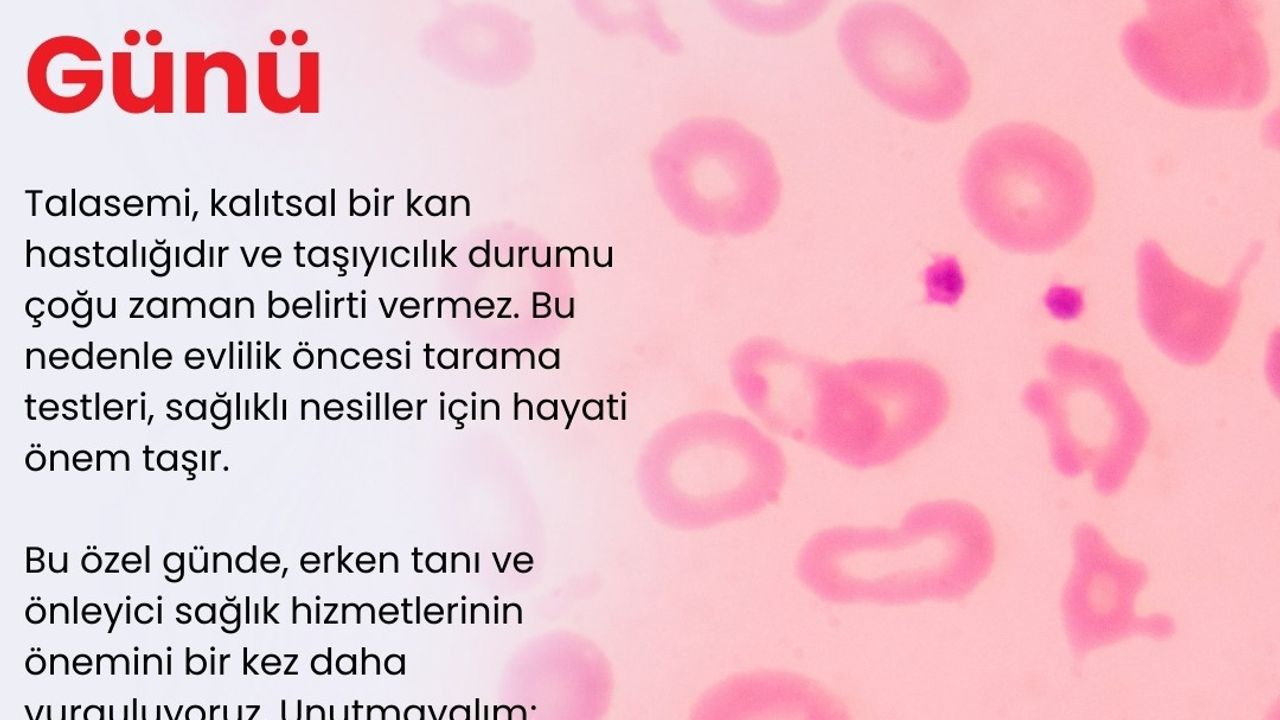 Eskişehir İl Sağlık Müdürü Doç. Dr. Yaşar Bildirici 8 Mayıs Dünya Talasemi Günü dolayısıyla yayınladığı mesajında hastalık hakkında bilgilendirme yaptı.