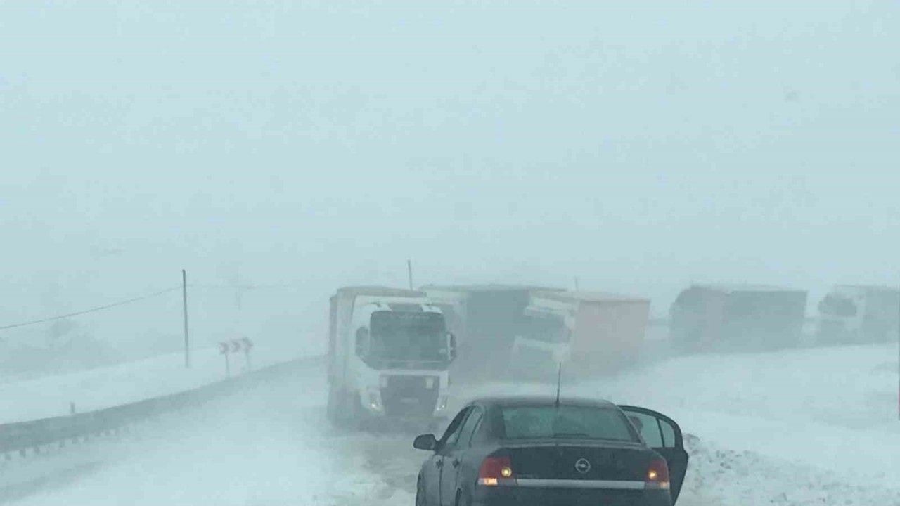Ardahan’ın Damal ve Posof ilçeleri arasındaki 2550 rakımlı Ilgar Dağı’nda kar yağışı ve tipi nedeniyle onlarca tır mahsur kaldı.