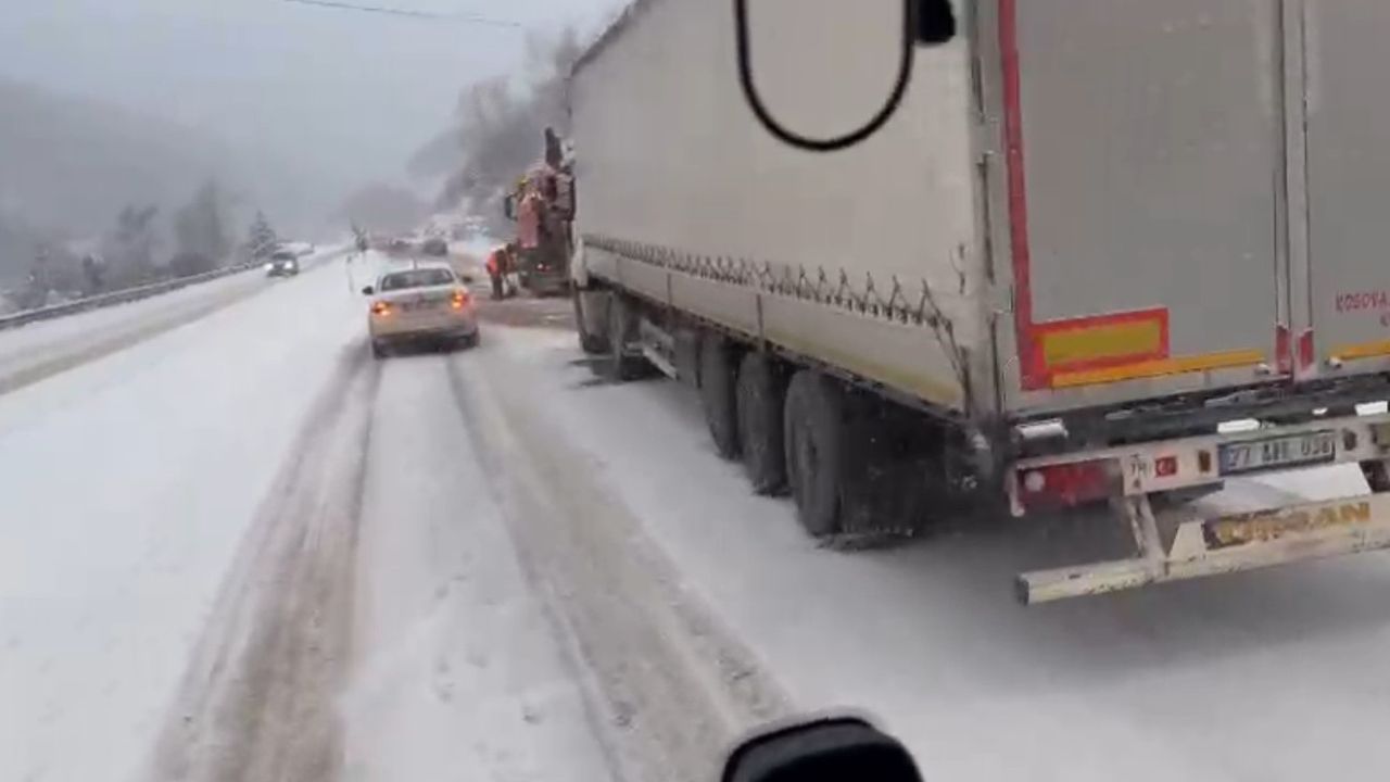 Kastamonu-Çankırı sınırında bulunan Ilgaz Dağı’nda akşam saatlerinde etkisini arttıran kar yağışı nedeniyle ağır tonajlı araçlar yolda mahsur kaldı. Araçların yolda kalması nedeniyle bir süreliğine trafik durdu.