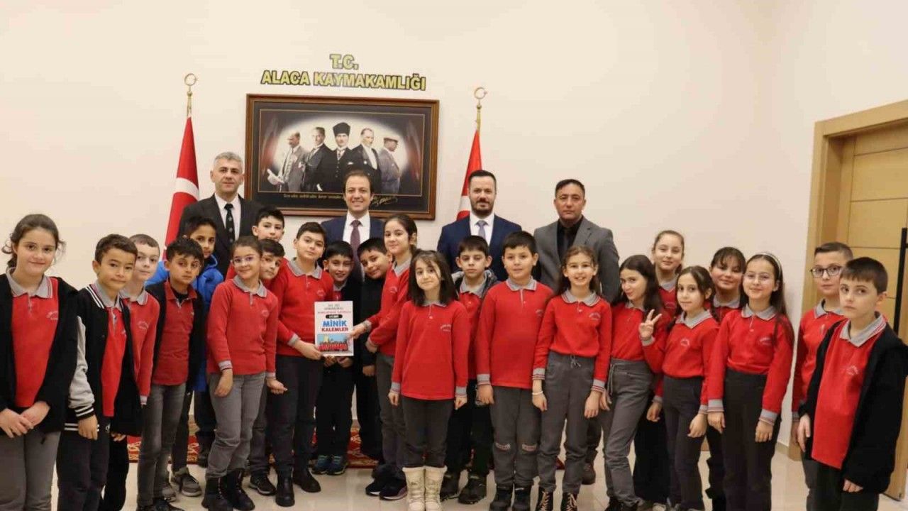 Çorum’un Alaca ilçesinde bulunan Dumlupınar İlkokulu’nda eğitim gören 4’üncü sınıf öğrencilerinin yazdığı hikayelerden oluşan "Minik Kalemler" adlı kitabı yayımlandı. Öğrenciler yazdıkları kitabı, ziyaret ettikleri Alaca Kaymakamı Engin Tok’a hediye etti. Ziyarette İlçe Milli Eğitim Müdürü Emrullah Şahin, Okul Müdürü Aydın Çevik ve sınıf öğretmeni Abdullah Yıldız da hazır oldu. Kitabı keyifle okuyacağını belirten Kaymakam Tok, öğrencilere özverilerinden dolayı teşekkür etti.