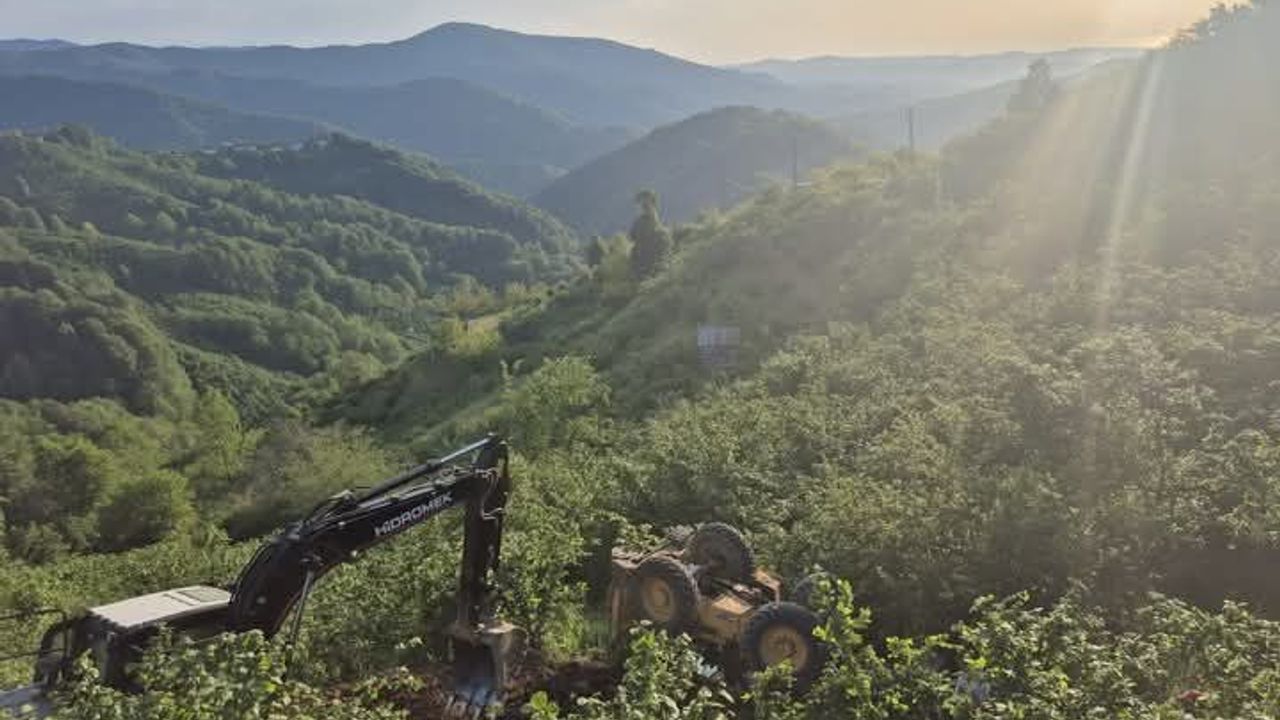 Zonguldak’ın Alaplı ilçesinde kontrolden çıkan iş makinesinin şarampole devrildiği kazada operatör, araçtan atlayarak kurtuldu.