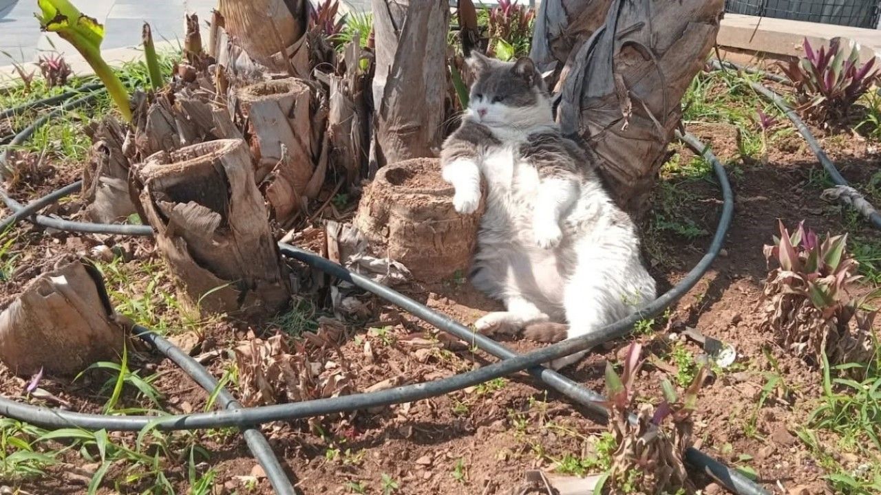 Muğla’nın Marmaris ilçesinde işçiler çevre düzenlemesi yaparken, keyfini bozmayan sokak kedisi görenleri gülümsetti.