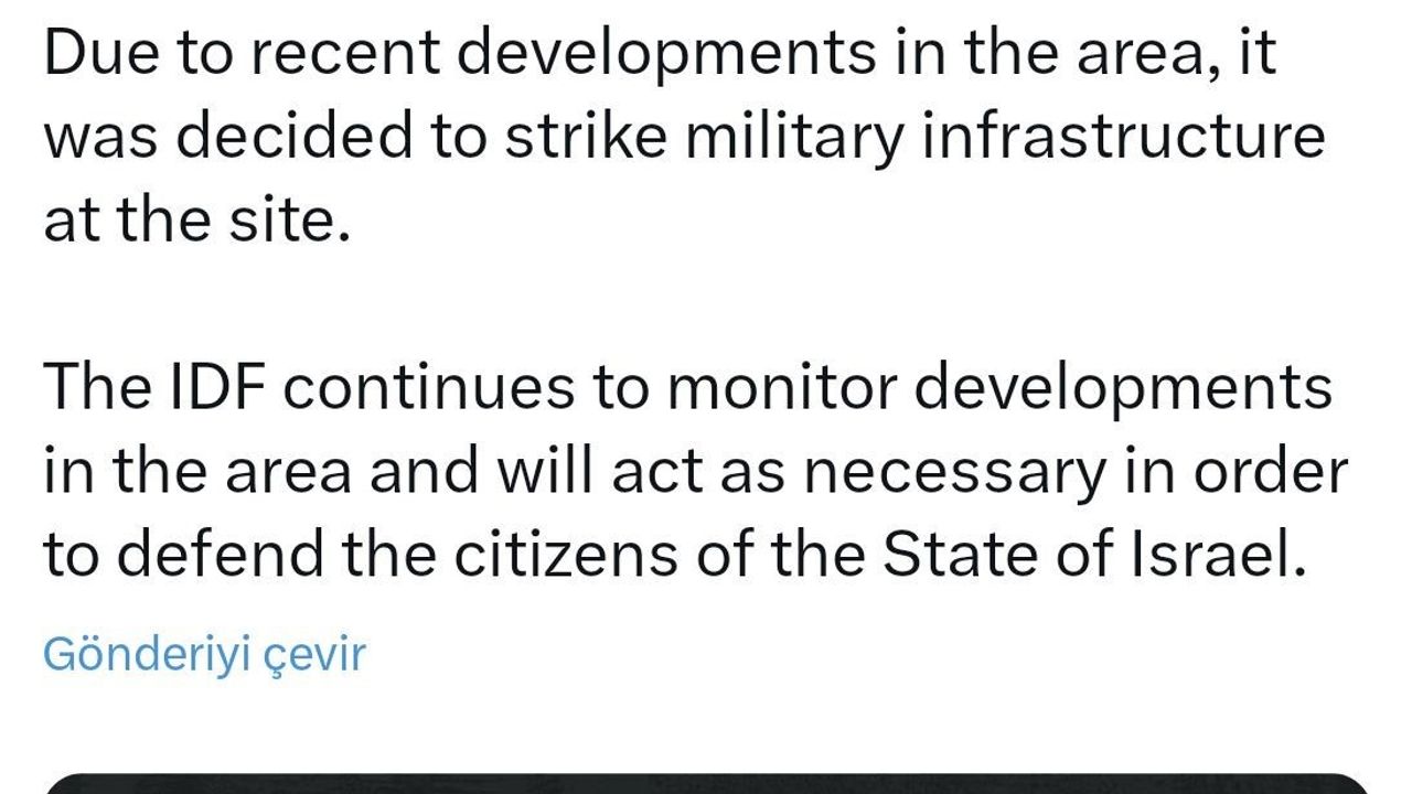 İsrail ordusu bir kez daha Suriye’yi hedef aldı. İsrail Savunma Kuvvetleri’nden (IDF) yapılan açıklamada, Lazkiye’ye bağlı Kardaha ilçesinde bulunan eski Suriye rejimine ait silahların depolandığı bir askeri bölgeye hava saldırısı düzenlendiği bildirildi. "Son gelişmeler nedeniyle bölgedeki askeri altyapının vurulmasına karar verildi" denilen açıklamada, "IDF bölgedeki gelişmeleri izlemeye devam ederek İsrail’in güvenliği için gerekli adımları atacaktır" ifadeleri kullanıldı.