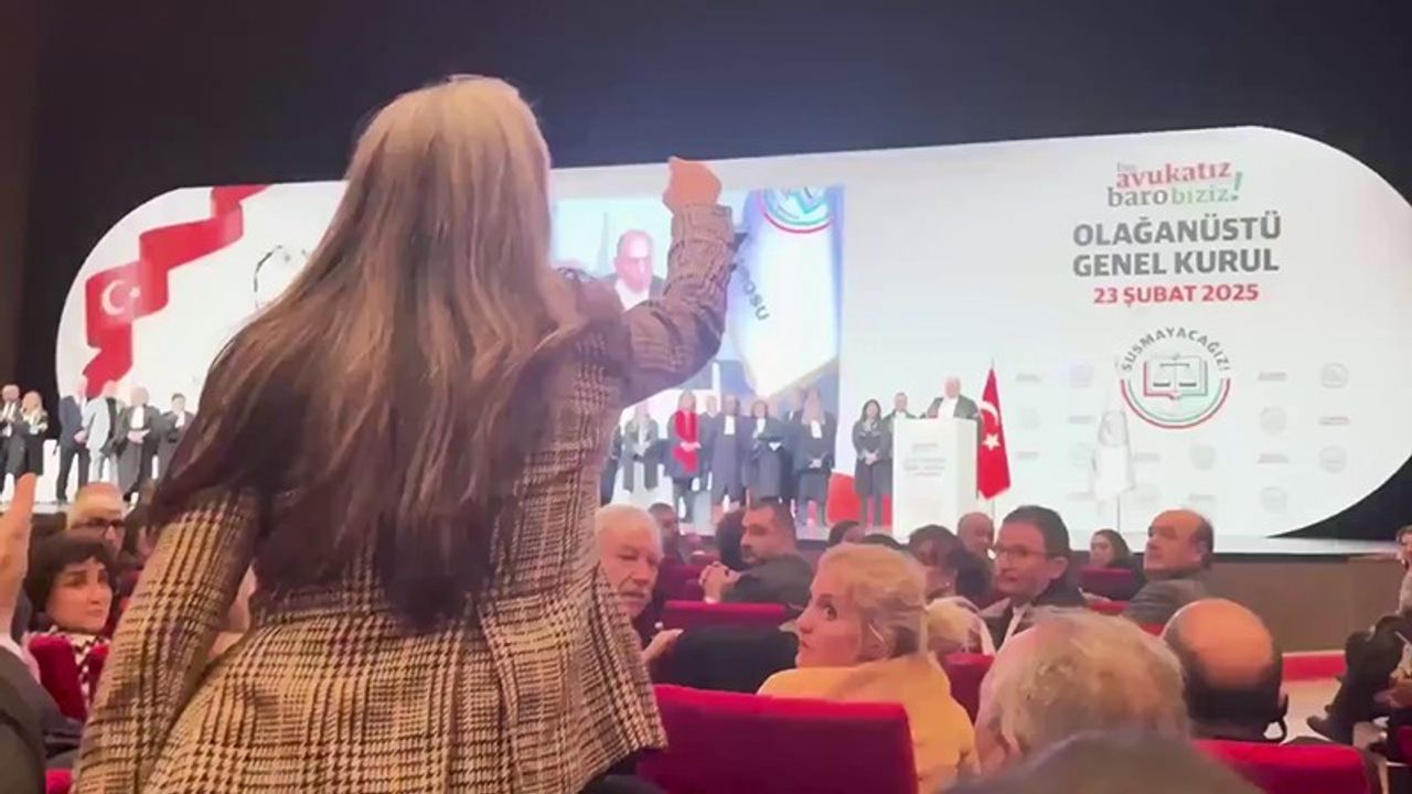 İstanbul 1 No’lu Barosu’nun Olağanüstü Genel Kurul toplantısında yabancı hukuk temsilcilerinin Türkiye’yi hedef alan konuşmaları sırasında yerinden kalkan kadın avukat, "Emperyalizmin temsilcileri mi bize insan haklarını öğretecek? İnsan hakları bu mu, bu adamlar mı insan haklarını öğretecek. Filistin için tek laf etmeyen biri hangi hukuktan bahsediyor?" diyerek tepki gösterdi.