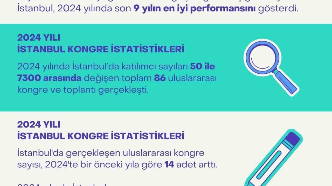 İstanbul, 2024’te katılımcı sayıları 50 ila 7 bin 300 arasında değişen 86 uluslararası kongreye ev sahipliği yaparak, dünya kongre şehirleri sıralamasında dünyada ve Avrupa’da birer sıra daha yukarı çıktı.