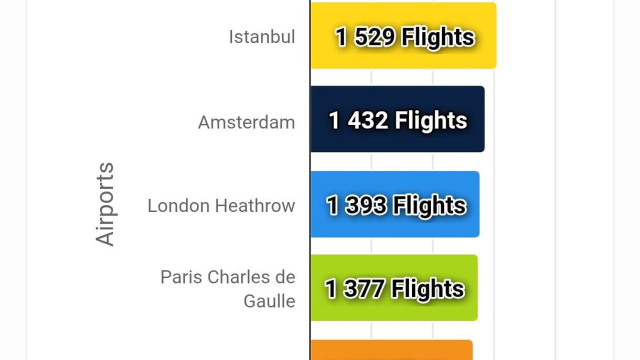 Avrupa Hava Seyrüsefer Güvenliği Teşkilatı (EUROCONTROL) tarafından yayımlanan ‘Avrupa Havacılık Raporu’na göre, İstanbul Havalimanı Avrupa’daki diğer büyük havalimanlarını geride bırakarak nisan ayında lider konumda yer aldı. İkinci sırada bin 432 uçuşla Amsterdam Schiphol, üçüncü sırada bin 393 uçuşla Londra Heathrow, dördüncü sırada bin 377 uçuşla Paris Charles De Gaulle yer alırken, bin 347 uçuşla Frankfurt Havalimanı beşinci sırada yerini aldı.