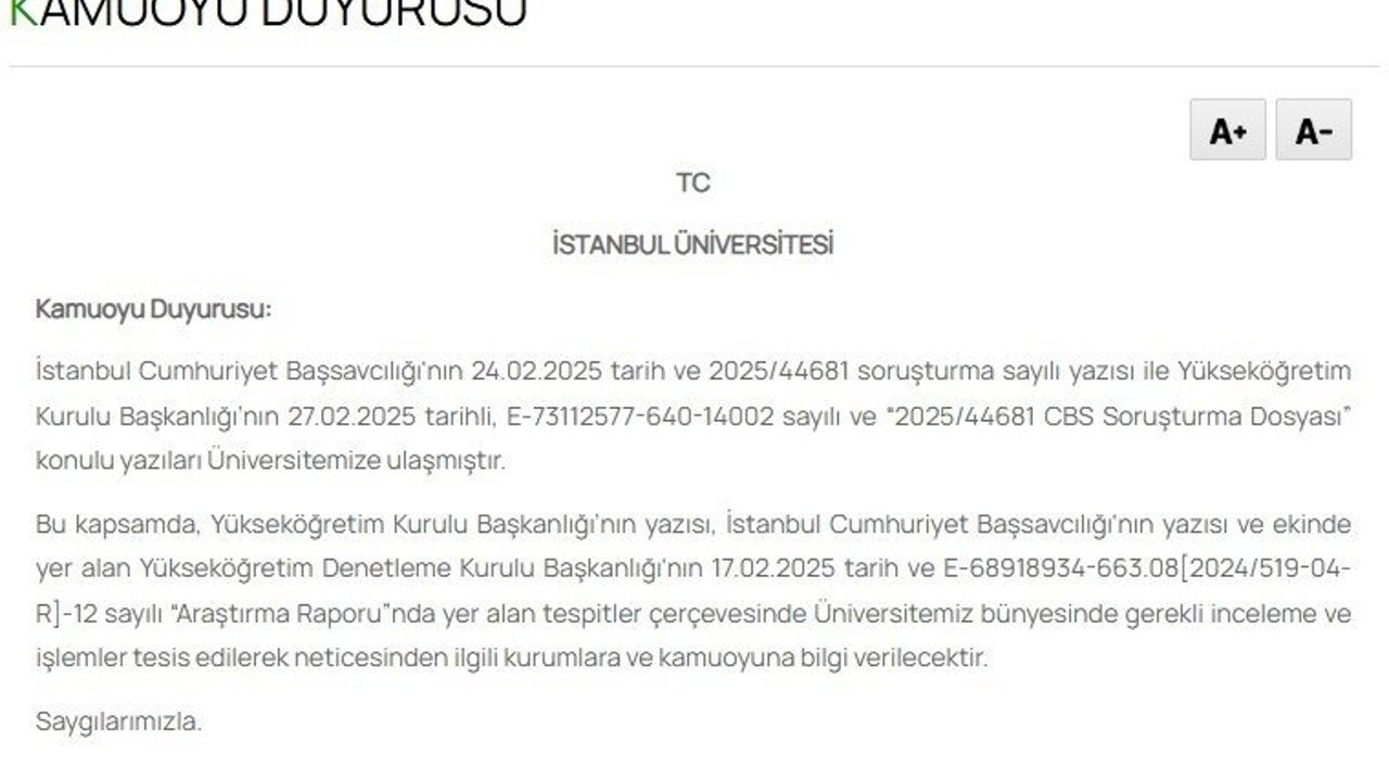 İstanbul Cumhuriyet Başsavcılığı, İstanbul Büyükşehir Belediye (İBB) Başkanı Ekrem İmamoğlu’nun lisans diplomasının sahte olduğuna ilişkin ihbarlar ve Yükseköğretim Kurulunca hazırlanan raporda diplomasının sahteliğine ilişkin tespitler üzerine, "resmi belgede sahtecilik" suçundan soruşturma başlatmıştı. İstanbul Üniversitesi, İBB Başkanı İmamoğlu’nun üniversite diplomasının sahte olduğu iddiasına ilişkin yapılan açıklamada, "İstanbul Cumhuriyet Başsavcılığının 24 Şubat 2025 tarih ve 2025/44681 soruşturma sayılı yazısı ile Yükseköğretim Kurulu Başkanlığının 27 Şubat 2025 tarihli ’Soruşturma Dosyası’ konulu yazıları üniversitemize ulaşmıştır. Bu kapsamda, Yükseköğretim Kurulu Başkanlığının yazısı, İstanbul Cumhuriyet Başsavcılığının yazısı ve ekinde yer alan Yükseköğretim Denetleme Kurulu Başkanlığının 17 Şubat 2025 tarihli ’Araştırma Raporu’nda yer alan tespitler çerçevesinde üniversitemiz bünyesinde gerekli inceleme ve işlemler tesis edilerek, neticesinden ilgili kurumlara ve kamuoyuna bilgi verilecektir" ifadelerine yer verildi.