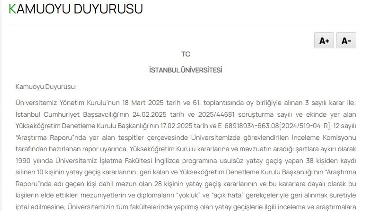 İstanbul Cumhuriyet Başsavcılığı tarafından İstanbul Büyükşehir Belediye Başkanı Ekrem İmamoğlu’nun lisans diplomasının sahte olduğu ile ilgili ihbarlar yapılmış, konuya ilişkin Yüksek Öğrenim Kurulu’nca (YÖK) hazırlanan raporda İmamoğlu’nun diplomasının sahteliğine ilişkin tespitler yer alması üzerine soruşturma başlatılmıştı. Soruşturma kapsamında İmamoğlu, ’resmi belgede sahtecilik’ suçundan ‘şüpheli’ sıfatıyla ifade vermiş, ayrıca İstanbul Cumhuriyet Başsavcılığı’nca İstanbul Üniversitesi Rektörlüğü’ne 2 kez yazı yazılmasının ardından İstanbul Üniversitesi, aralarında İmamoğlu’nun da bulunduğu 28 kişinin diplomalarının ’yokluk’ ve ’açık hata’ gerekçeleriyle iptal edildiğini duyurmuştu. O isimlerden biri olan Galatasaray Üniversitesi İktisadi ve İdari Bilimler Fakültesi Öğretim Üyesi Prof. Dr. Naciye Aylin Ataay Saybaşılı görevine devam ederken, üniversiteden edinilen bilgiye göre sürecin devam ettiği ve nihai kararın beklendiği öğrenildi. Prof. Dr. Saybaşılı’nın isminin Galatasaray Üniversitesi internet sitesinde bulunan akademik kadro bölümünde yer aldığı görüldü.