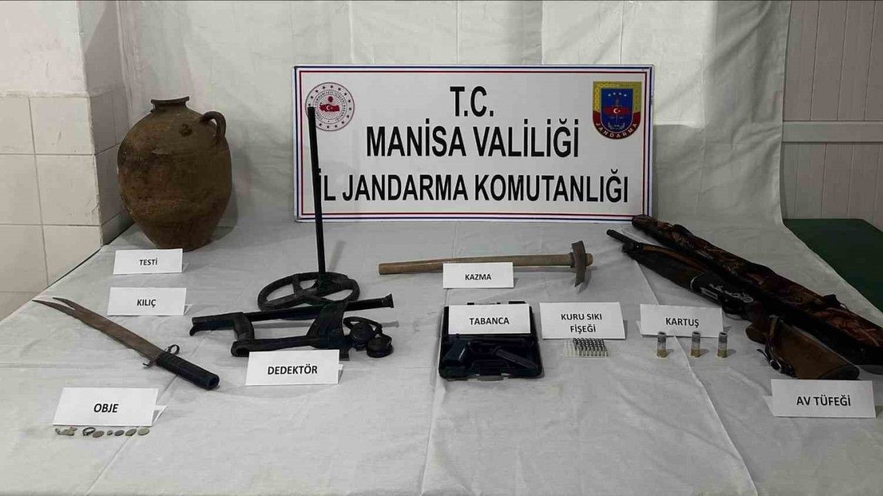 Manisa’nın Demiri ilçesinde Sidas Antik Kentinde kaçak kazı yaptığı belirlenen şahsa yönelik yapılan değerlendirmede çok sayıda tarihi eser olduğu değerlendirilen obje ile ruhsatsız silah ele geçirildi.