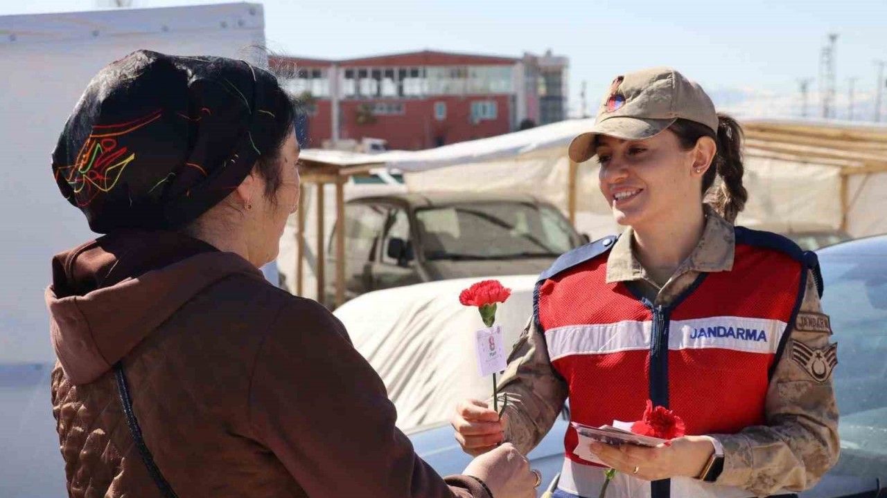 Elazığ İl Jandarma Komutanlığında görevli kadın personel, kadınlara karanfil dağıtarak günlerini kutladı.