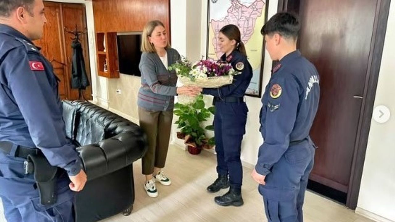 Aydın’ın Nazilli ilçesinde jandarma ekipleri Kaymakam Huriye Küpeli Kan’ı ziyaret ederek Dünya Kadınlar Günü dolayısıyla çiçek takdim etti.