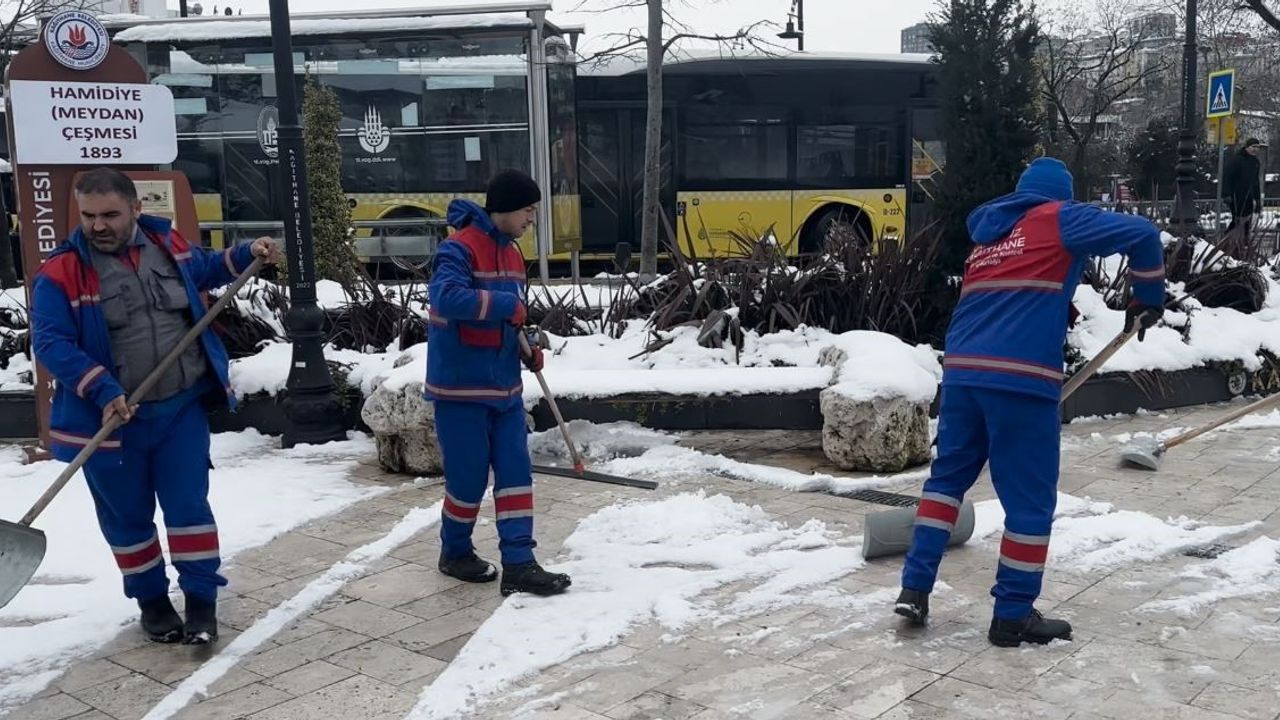 Kağıthane kar yağışıyla beyaz örtüyle kaplanırken, belediye ekipleri vatandaşların olumsuz bir durum yaşamaması için kaldırım, üst geçit ve merdivenlerdeki karları temizliyor.