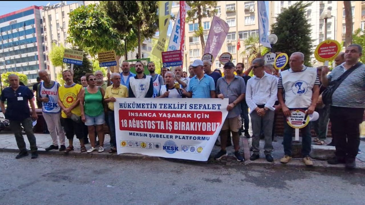 Çalışma ve Sosyal Güvenlik Bakanı Vedat Işıkhan'ın açıkladığı teklifi protesto etme kararı alan sendikalar bugün iş bırakacaklarını açıkladı. Mersin’de de KESK Şubeler Platformu, yaptığı açıklamada 18 Ağustos günü iş bırakma eylemi yapacaklarını bildirmişti. Yapılan açıklamada taleplerini dile getiren platform, 2026 ve 2027 yıllarına dair tekliflerin iyileştirilmemesi halinde eylemlerini bugün hayata geçirecek. Mersin’de binlerce memur ve sendikaları bugün yapılacak iş bırakmaya hazırlanıyor. İş bırakmaya dair açıklama yapacak olan sendikalar 10.30’da sokağa inecek.