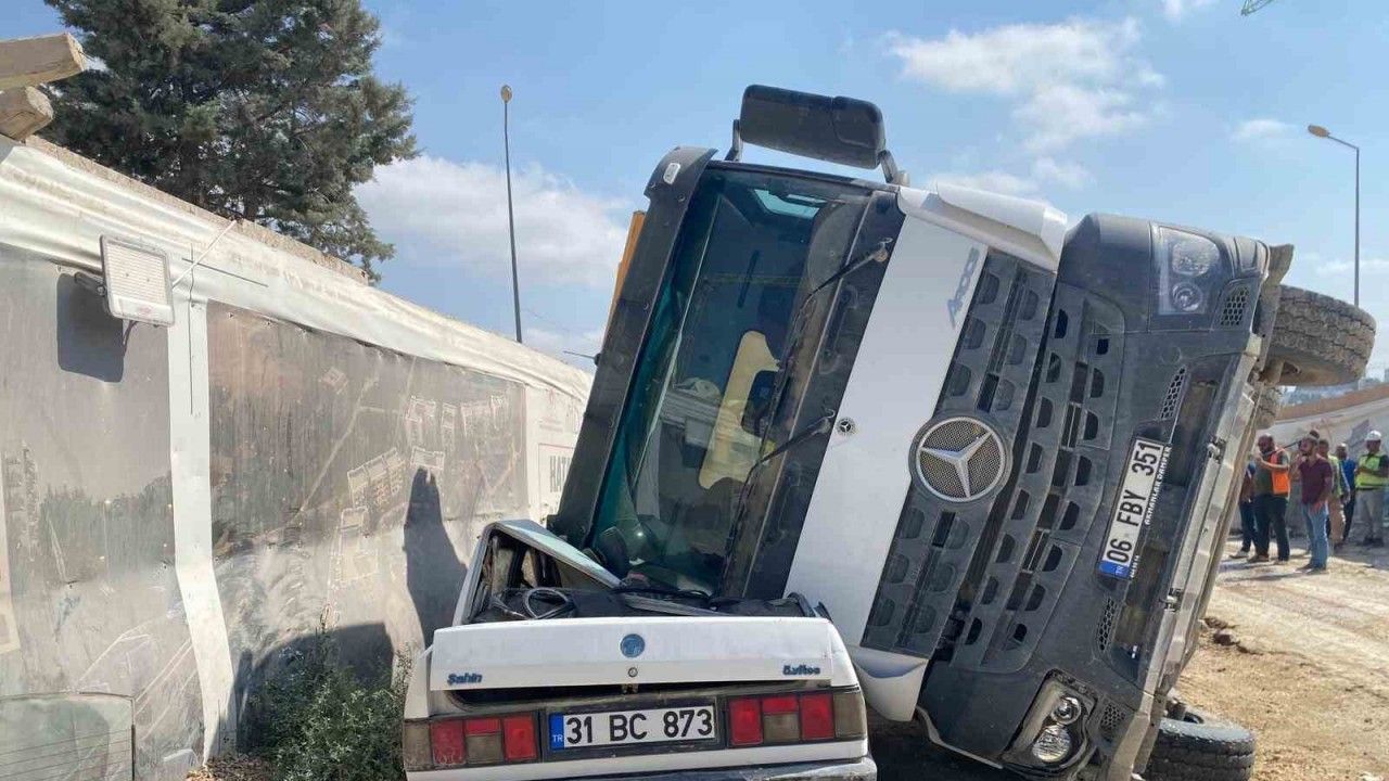 Kaza, Defne ilçesi Çekmece Mahallesi şantiye alanında yaşandı. Şantiye içerisinde seyir halindeki 06 FBY 351 plakalı Mercedes marka toprak yüklü kamyon, park halindeki 31 BC 873 plakalı Tofaş marka otomobilin üzerine devrildi. Kamyonun üzerine devrildiği otomobil hurda yığınına dönerek kullanılamaz hale geldi. Kamyonun üzerine devrildiği sırada otomobilde kimsenin olmaması muhtemel bir faciayı önledi.