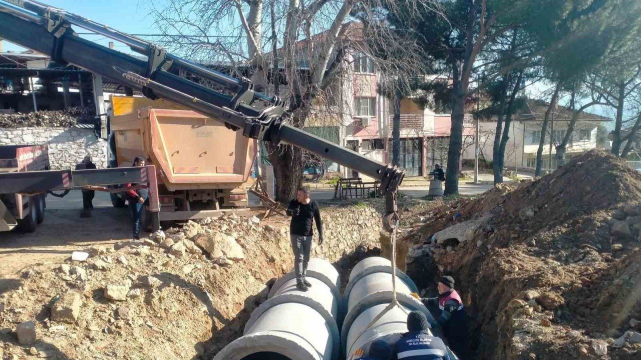 Aydın’ın Karacasu ilçesinde devam eden alt yapı çalışmaları kapsamında bölgeye getirilen beton büzler yer altına indirildi.