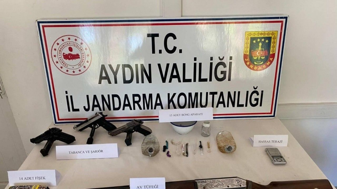 Aydın İl Jandarma Komutanlığı KOM Şube Müdürlüğü ve Karacasu İlçe Jandarma Komutanlığınca uyuşturucu madde imal ve ticaretine yönelik çalışma başlatıldı. Karacasu ilçesinde O.G. isimli şüpheli şahsın ikametinde ve eklentilerinde yapılan aramada, 15 Adet uyuşturucu kullanma aparatı, 1 Adet hassas terazi, 3 Adet tabanca ve tabancaya ait şarjör, 1 Adet av tüfeği, 14 Adet kurusıkı tabanca ele geçirildi. Yakalanan şüpheli hakkında adli sürecin devam ettiği öğrenildi.