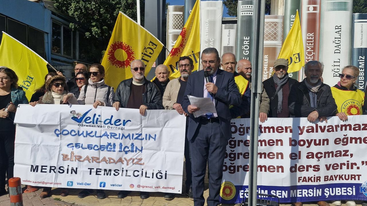 Kamu Emekçileri Sendikaları Konfederasyonu’na (KESK) bağlı Eğitim ve Bilim Emekçileri Sendikası (Eğitim Sen) Mersin Şubesi, Öğrenci Veli Derneği Mersin Şubesi (Veli-Der) ve Özel Sektör Öğretmenleri Sendikası Mersin Şubesi, Mersin İl Milli Eğitim Müdürlüğü önünde toplanarak, MEB’in 2025-2026 eğitim-öğretim yılının birinci dönem karnesini kamuoyuna açıkladılar. Açıklamayı Eğitim Sen Mersin Şubesi Yükseköğretim ve Eğitim Sekreteri Selda Karaseki okudu.