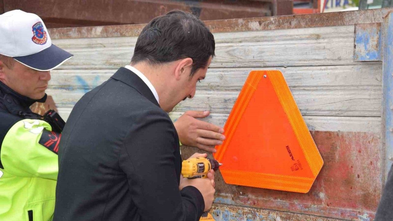 Konya’nın Karapınar ilçesinde Trafik Haftası etkinlikleri çerçevesinde Kaymakam Şenol Öztürk tarafından çiftçilere reflektör dağıtımı yapıldı.