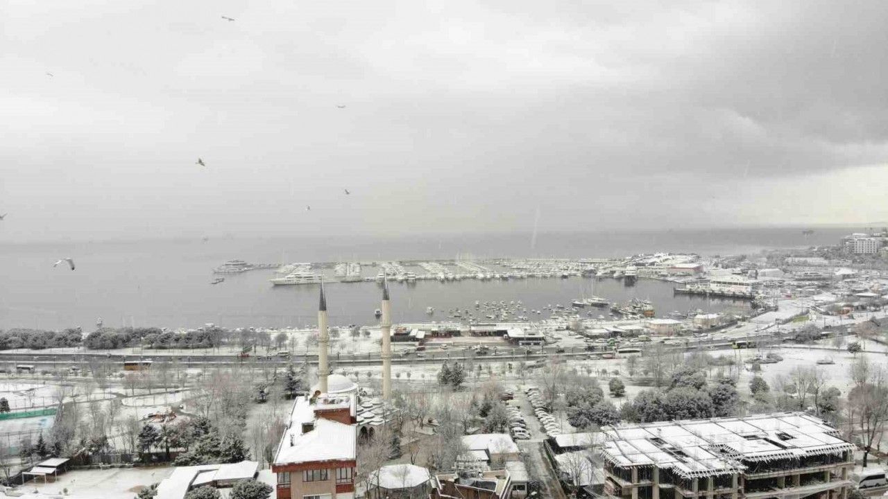 İstanbul’da etkisini gösteren kar yağışı sonrasında adeta beyaz örtüyle kaplanan Pendik Marina ve çevresi dronla görüntülendi.