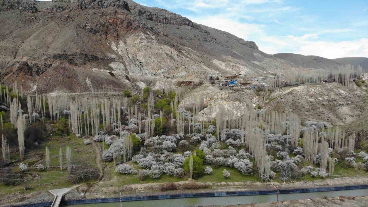 Türkiye’nin kayısı üretimindeki önemli yerlerinden birisi olan ve Aras Nehri yatağında bulunan Kağızman’daki kayısı bahçelerinde renk cümbüşü yaşanıyor. Açtığı çiçeklerle uzun kavak ağaçlarının arasında bulunan kayısı ağaçları havadan görüntülendi.