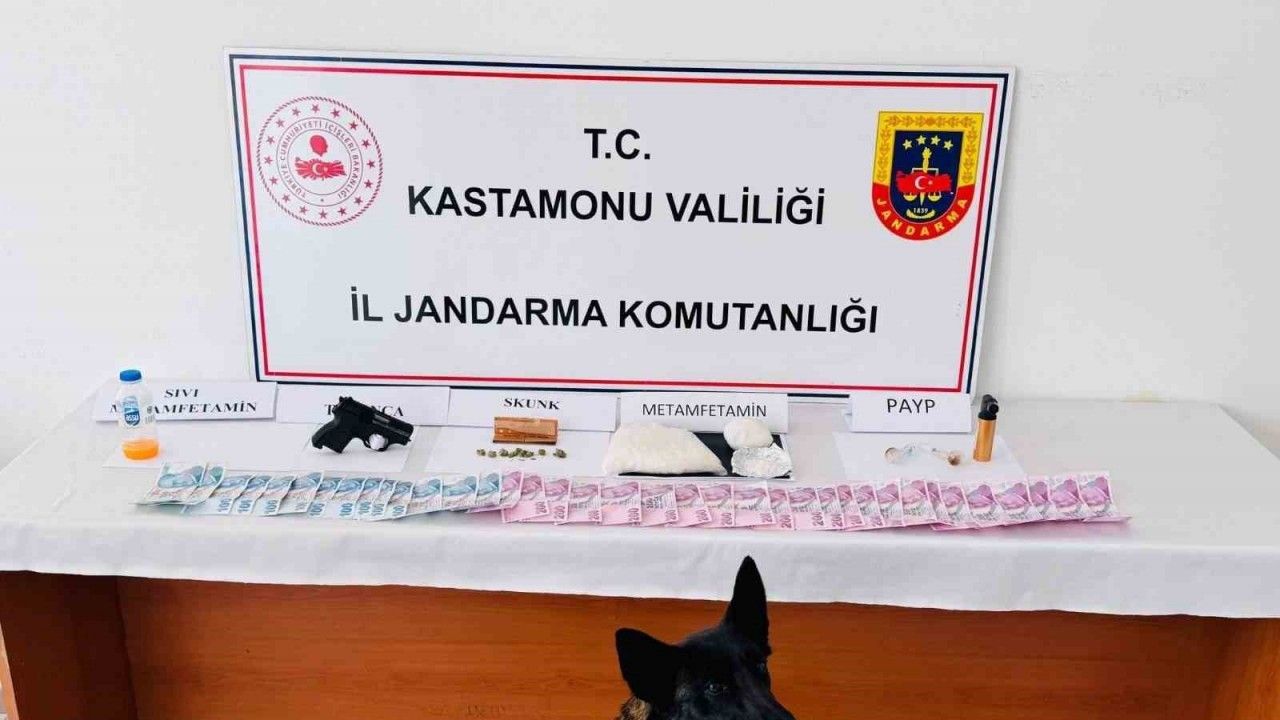 Edinilen bilgiye göre, Kastamonu İl Jandarma Komutanlığı ekiplerince uyuşturucu madde imal ve ticaretinin önlenmesine yönelik yürütülen çalışmalar çerçevesinde, Merkez ilçede G.Y., M.A.K., T.A. ve Z.F. isimli şahısların içinde bulunduğu araçta arama yapıldı.Aramada bir miktar metamfetamin, bir miktar skunk, 1 adet ruhsatsız tabanca, 6 bin 130 TL suçtan elde edildiği değerlendirilen para ele geçirildi.