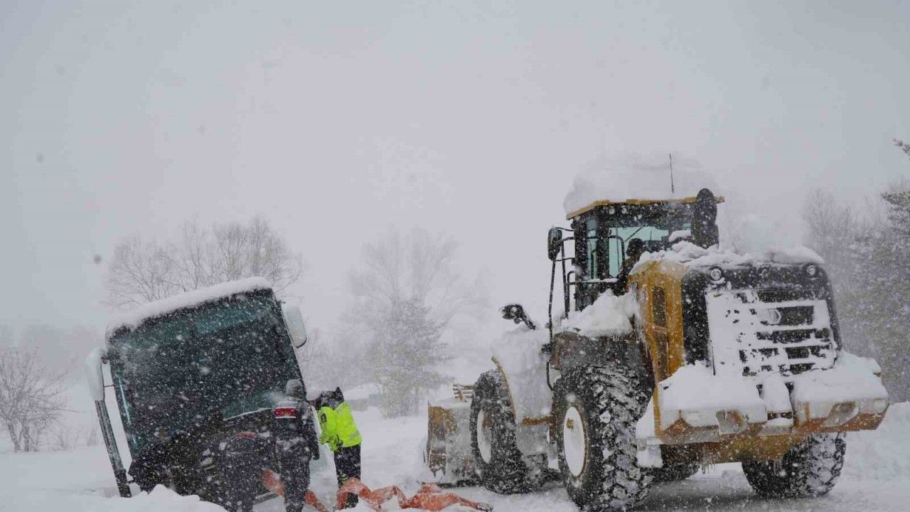 Kastamonu’nun Devrekani ilçesinde yoğun kar yağışı sebebiyle yoldan çıkan otobüs kara batarak 5 saat boyunca mahsur kaldı. Yara almadan kurtulan yolcular ise jandarma ekiplerince başka bir araçla tahliye edildi.