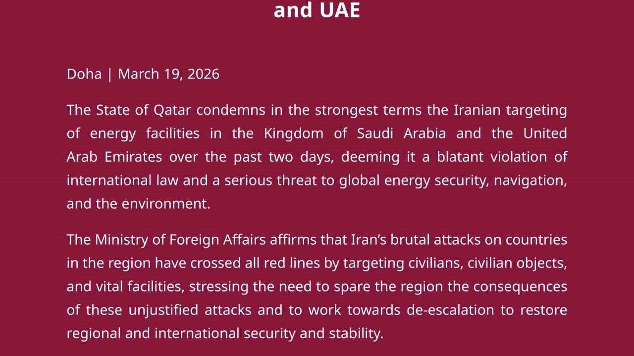 Katar'dan, İran'ın Suudi Arabistan ve BAE'deki enerji tesislerine yönelik saldırılarına tepki geldi. Katar Dışişleri Bakanlığı'ndan yapılan açıklamada, Tahran'ın enerji tesislerini hedef almasının şiddetle kınandığı vurgulanarak, 'Bu saldırıları uluslararası hukukun açık bir ihlali ve küresel enerji güvenliği, denizcilik ve çevre için ciddi bir tehdit olarak değerlendiriyoruz' denildi. İran'ın Körfez ülkelerine yönelik misillemelerine tepki gösterilerek, 'İran'ın bölgedeki ülkelere yönelik acımasız saldırıları sivilleri, sivil altyapıları ve hayati tesisleri hedef alarak tüm kırmızı çizgileri aşmıştır. Bölgenin bu haksız saldırıların sonuçlarından korunması ve bölgesel ve uluslararası güvenlik ve istikrarın yeniden sağlanması adına gerilimin azaltılması yönünde çalışılması gerektiğinin altını çiziyoruz' ifadelerine yer verildi. Katar'ın kardeş ülkelerle tam dayanışma içinde olduğu ve bu ülkelerin egemenliklerini, güvenliklerini ve toprak bütünlüklerini korumak için aldıkları tüm önlemleri desteklediği aktarıldı.