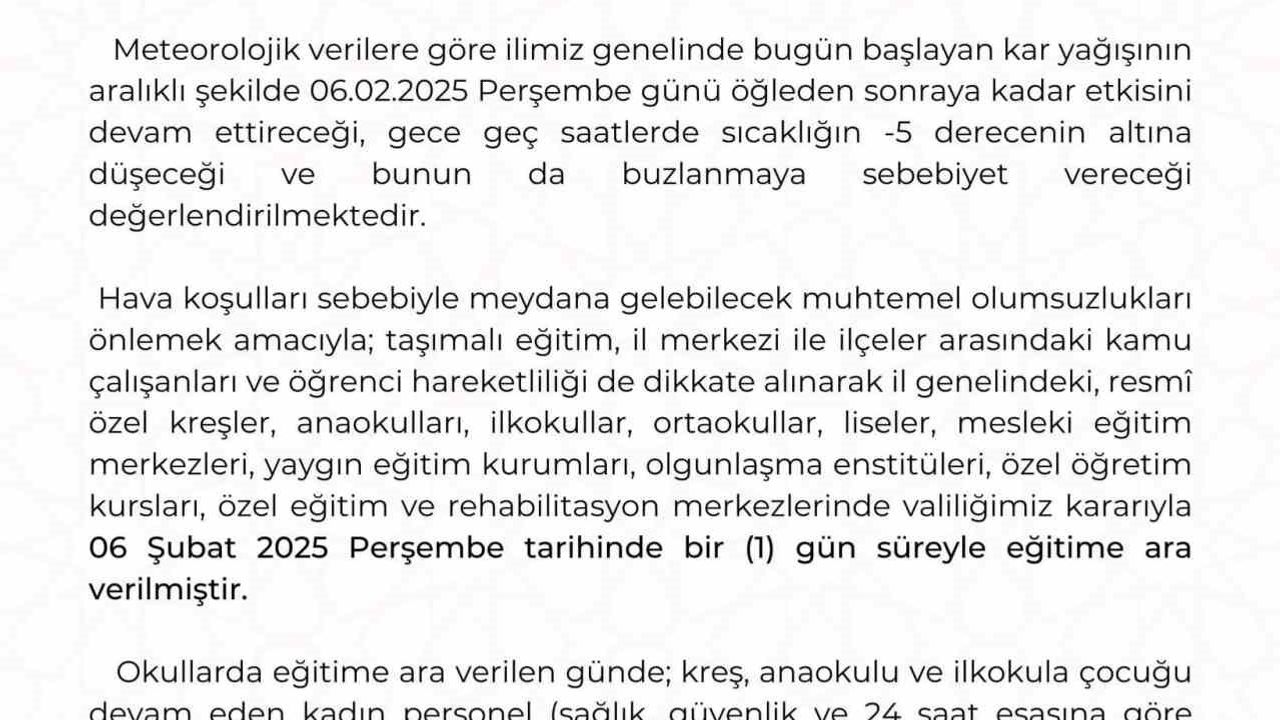 Kayseri Valiliği’nden yapılan açıklamada, "Meteorolojik verilere göre ilimiz genelinde bugün başlayan kar yağışının aralıklı şekilde 6 Şubat 2025 Perşembe günü öğleden sonraya kadar etkisini devam ettireceği, gece geç saatlerde sıcaklığın -5 derecenin altına düşeceği ve bunun da buzlanmaya sebebiyet vereceği değerlendirilmektedir. Hava koşulları sebebiyle meydana gelebilecek muhtemel olumsuzlukları önlemek amacıyla; taşımalı eğitim, il merkezi ile ilçeler arasındaki kamu çalışanları ve öğrenci hareketliliği de dikkate alınarak il genelindeki, resmî özel kreşler, anaokulları, ilkokullar, ortaokullar, liseler, mesleki eğitim merkezleri, yaygın eğitim kurumları, olgunlaşma enstitüleri, özel öğretim kursları, özel eğitim ve rehabilitasyon merkezlerinde valiliğimiz kararıyla 06 Şubat 2025 Perşembe tarihinde 1 gün süreyle eğitime ara verilmiştir. Okullarda eğitime ara verilen günde; kreş, anaokulu ve ilkokula çocuğu devam eden kadın personel (sağlık, güvenlik ve 24 saat esasına göre hizmet veren birimlerde çalışan personelin durumu hizmetin gereği olarak ilgili birim amirleri tarafından değerlendirilecektir), malul, engelli, ağır kronik rahatsız ve hamile kamu çalışanları da idari izinli sayılacaktır" denildi.