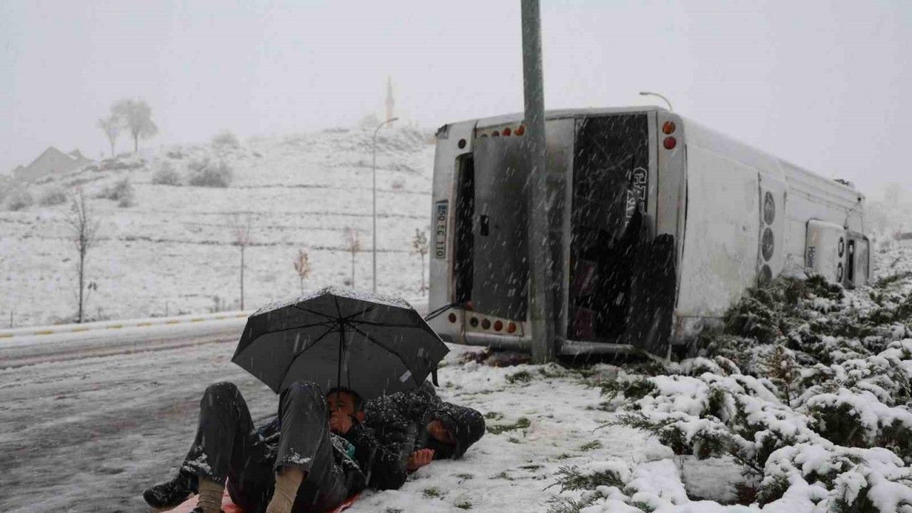 Edinilen bilgiye göre, Mehmet Akif Ersoy Mahallesi Kayaşehir yolu mevkide meydana gelen kazada, rampa aşağı inen A.A. idaresindeki 50 EC 110 plakalı işçi servisi buzlanma nedeni ile kayganlaşan yolda sürücüsünün direksiyon hakimiyetini kaybetmesi sonucu takla attı. Refüje çarparak duran işçi servis aracında bulunan 14 kişi yaralanırken, haber verilmesi üzerine olay yerine sağlık, polis, itfaiye ve AFAD ekipleri sevk edildi.