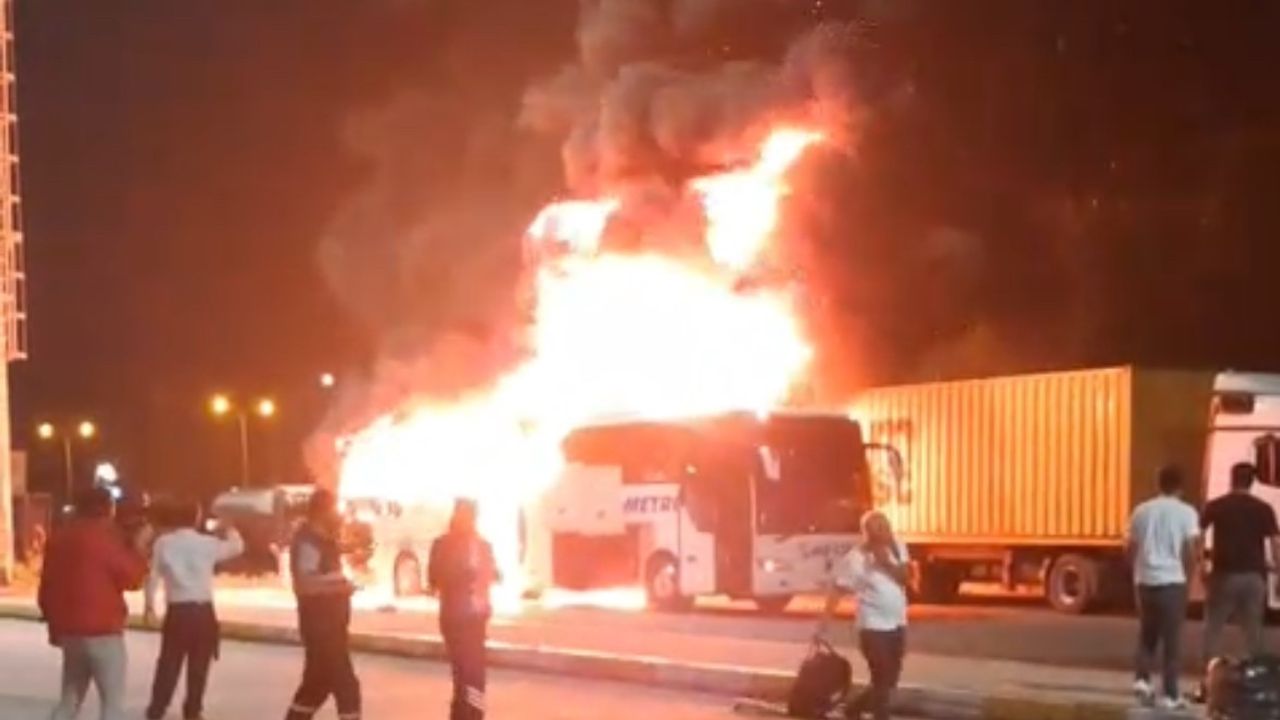Kocaeli’nde dinlenme tesisinde mola veren yolcu otobüsü alev alev yandı.