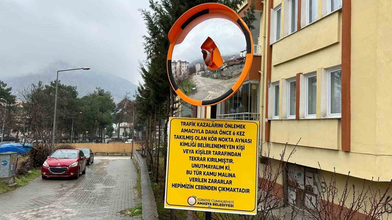 Amasya’da bir sokakta bulunan kör nokta aynası 7. defa kırıldı. Amasya Belediyesi, Şeyhcui Mahallesinde daha önce farklı günlerde kırılıp 6 defa yenilendiğini açıkladığı aynanın fotoğrafını sosyal medyada paylaşıp altına uyarı panosu astı.