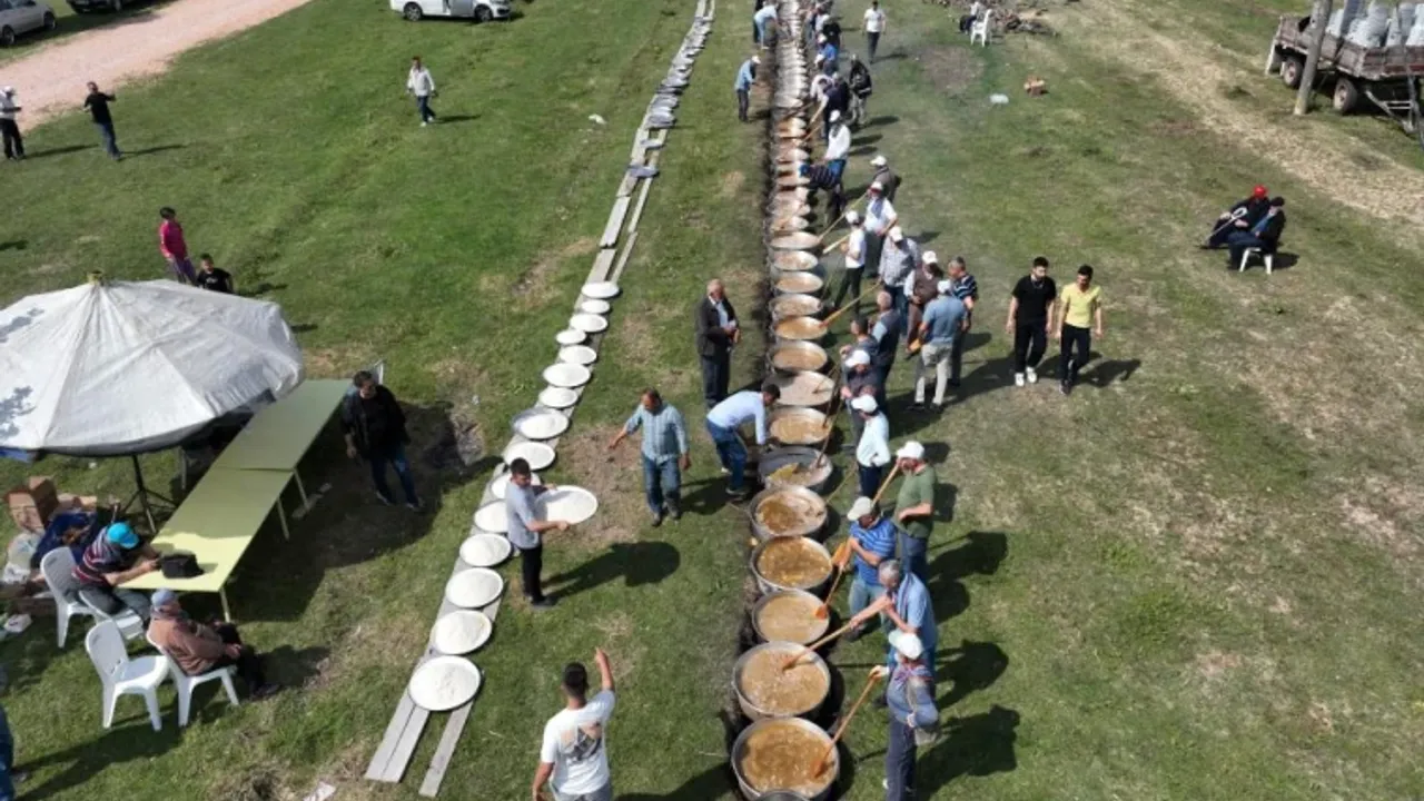 Panayır havasında yapılan köy hayrı için seçilen 38 küçükbaş ile 3 büyükbaş hayvan sabah namazının ardından kesilip parçalanarak 55 ayrı kazana konuldu. Kazanlar için önceden açılan yaklaşık 200 metre uzunluğundaki çukurun içerisine odun atılarak ateş yakıldı. 55 kazan yan yana getirilip pay edilen etler odun ateşinde 3 saat kaynadıktan sonra üzerlerine önce 1 ton buğday, tereyağı ve ardından da 1 ton pirinç ile su eklenerek 2 saat boyunca karıştırıldı. İmece usulü kazan karıştırmaya köyün tüm erkekleri katıldı. Arada kazanları dolaşan tuzcular yapılan yemeğin tuzunu kontrol etmek için tattı. 2 saat sonra el birliğiyle ateş üzerinden çekilen kazanlar 2 saat boyunca dinlendirildikten sonra Yamanlar Mahallesi'ndeki mesire alanında toplanan binlerce kişilik kalabalığa dağıtıldı. Adeta panayır havasında geçen köy hayrı ile yan yana ateşe konulan 55 kazanda pişen etli pilav gökyüzünden drone ile de görüntülendi. Kamyonetlere yüklenen tepsiler dolusu pilav kısa sürede tüm halka dağıtıldı.