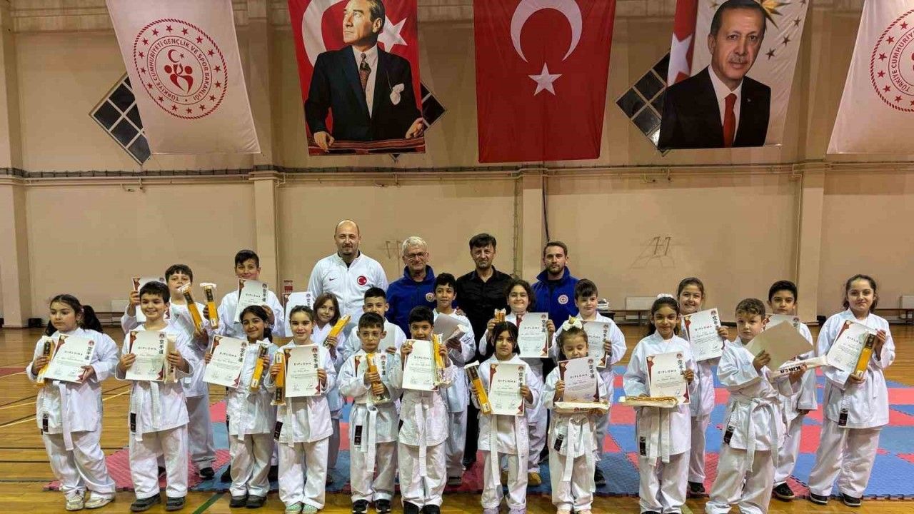 Dört aylık yoğun antrenman sürecinin ardından kuşak sınavına katılan 60 küçük karateci, hünerlerini sergileyerek izleyenlerin takdirini topladı.
