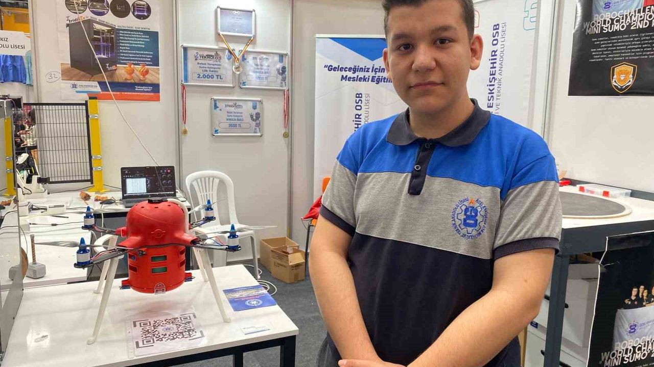 Özel Eskişehir OSB Teknik Koleji 10. sınıf Plastik Bölümü öğrencisi Yiğit İşbilirler, elektronik aksamı hariç gövdesini tamamen kendi 3D baskı makinesiyle yangın söndürme dronu üretti. Elektronik aksamı haricinde gövdesini ve her şeyini kendi ürettikleri yazıcıda yaptıklarını anlatan İşbilirler, "Böylelikle Türkiye’de olan dronların üstüne bir şeyler katarak kendi yangın söndürme dronumuzu ürettik. İçindeki söndürme topu sayesinde 5 kilometrelik bir alanı yangın yayılmadan ateşin olduğu yere gidip söndürüyor. Aslında amacımız yayılmadan yangını söndürmek. Fuarda çok ilgi gören dronlar arasından birisi. Önümüzdeki günlerde MEB Robot Yarışması’na gideceğiz" dedi.