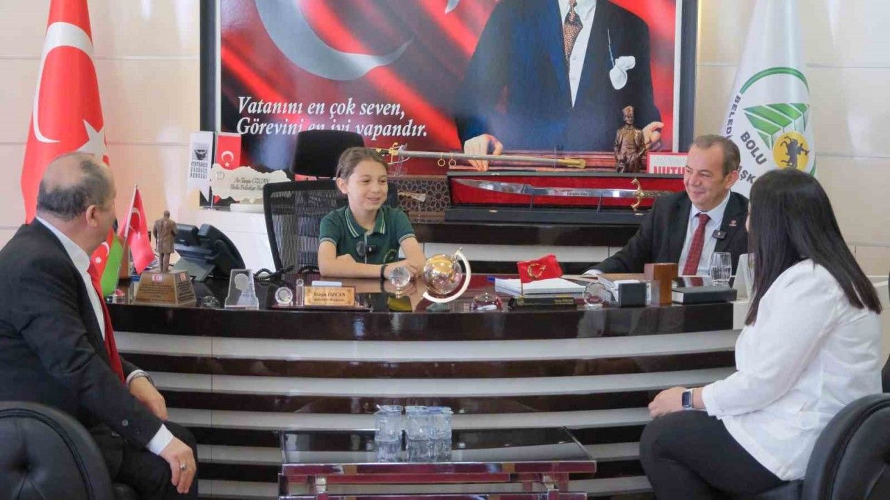 Bolu Belediye Başkanı Tanju Özcan, 23 Nisan Ulusal Egemenlik ve Çocuk Bayramı sebebiyle başkanlık koltuğunu Mehmet Akif Ersoy İlkokulu 4-D sınıfı öğrencisi Ali Ömer İbar’a devretti.