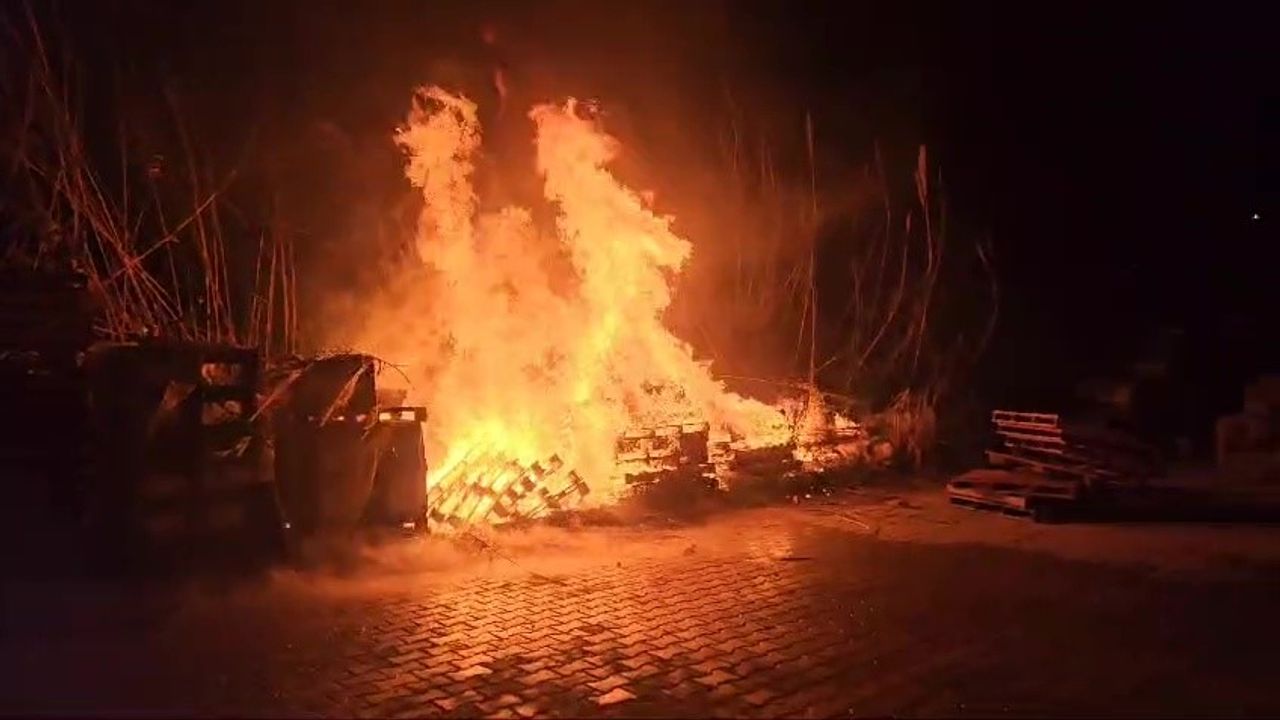 Manavgat’ta elektrik tellerinden çıkan kıvılcımlar iş yerinin önündeki palet ve palmiyeleri tutuşturdu. Çıkan yangın büyümeden söndürüldü.