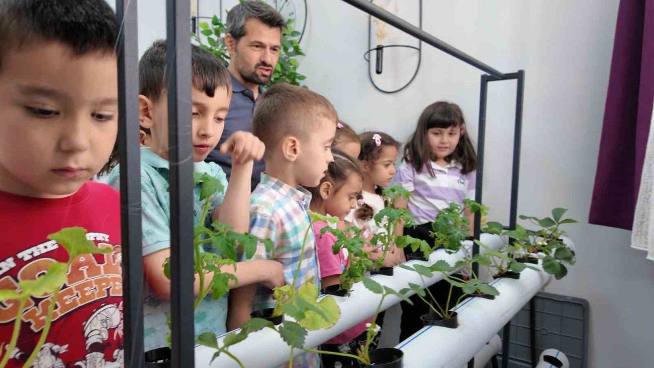 Gediz Ovasının bereketli topraklarının büyük bir kısmına sahip olan Manisa’da öğrenciler küçük yaşlardan itibaren tarımsal üretim bilinci ile yetişiyor. Yunusemre Türk Kızılay İlkokulu anasınıfı öğrencileri, öğretmenlerinin rehberliğinde topraksız tarım olan hidroponik sistemle kavun, salatalık, domates, çilek gibi ürünler yetiştiriyor.