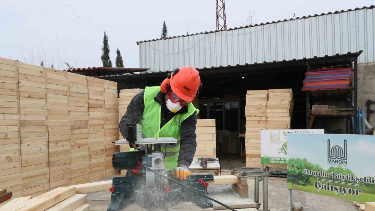Mardin Büyükşehir Belediyesi, park, bahçe, meydan ve yeşil alanlar için çevre dostu, estetik ahşap saksı üretiyor.