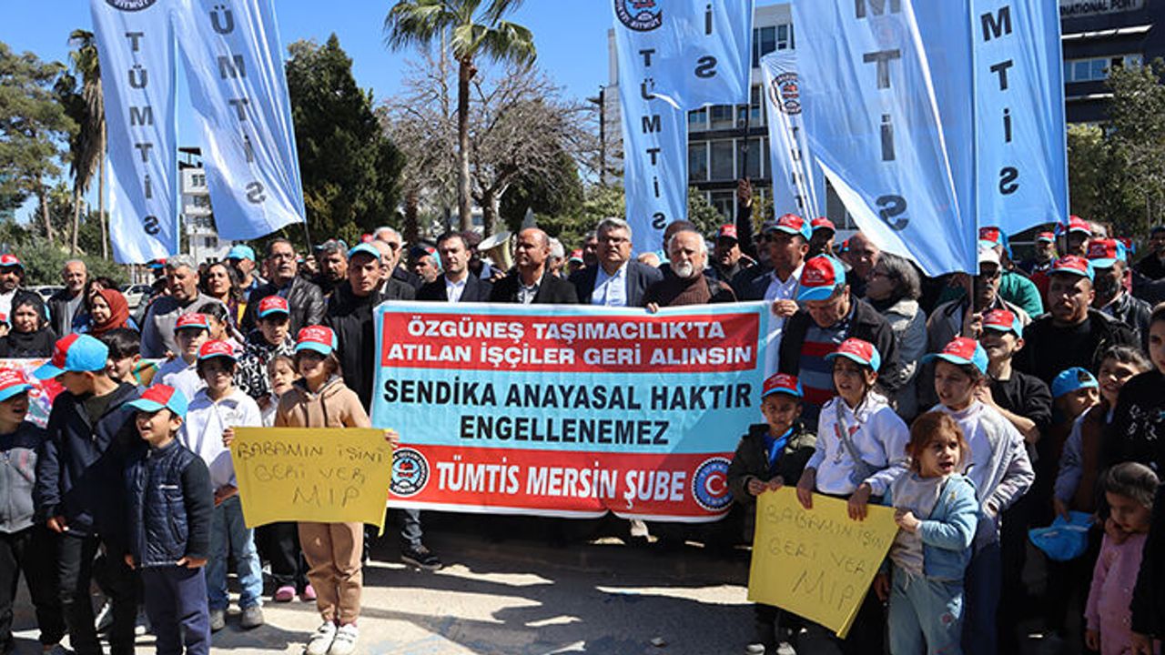 Türkiye İşçi Sendikaları Konfederasyonu’na (TÜRK-İŞ) bağlı Tüm Taşıma İşçileri Sendikası (TÜMTİS) Mersin Şubesi’ne üye işçiler, aileleriyle birlikte geldikleri MIP önünde toplanarak sendikalı olma haklarını tekrar savundular. Burada bir basın açıklaması gerçekleştiren işçilere Mersin Emek ve Demokrasi Platformu üyeleri de destek verdi. Açıklamayı işçiler adında TÜMTİS Mersin Şube Başkanı Savaş Gürkan yaptı.