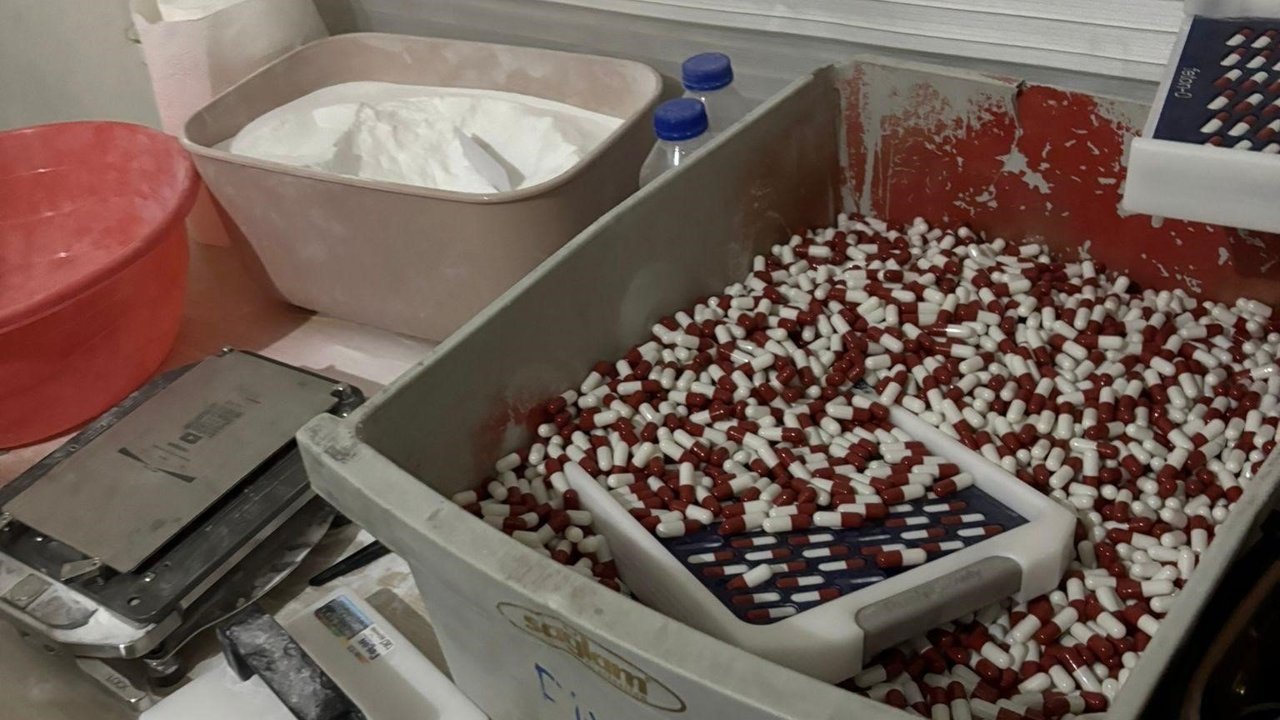 Mersin İl Emniyet Müdürlüğü Narkotik Suçlarla Mücadele Şube Müdürlüğü ile Mezitli İlçe Emniyet Müdürlüğü ekiplerince, uyuşturucu madde ticareti ve kullanımını engellemeye yönelik yürütülen çalışmalar kapsamında Yenişehir ilçesinde bir adreste sentetik ecza hap üretimi yapıldığı bilgisine ulaşıldı. Belirlenen adrese düzenlenen operasyonda, 65 kilo 250 gram sentetik ecza ham maddesi (pregabalin), 45 bin 482 adet doldurulmuş kapsül, 135 bin 100 adet boş kapsül, bin 850 adet ilaç kutusu, 25 gram metamfetamin, 810 adet beyaz renkli hap kutusu, 420 adet kapak, 2 adet ilaç basım makinesi, 1 adet mikser ile 708 blister halinde 9 bin 912 adet sentetik ecza ele geçirildi.