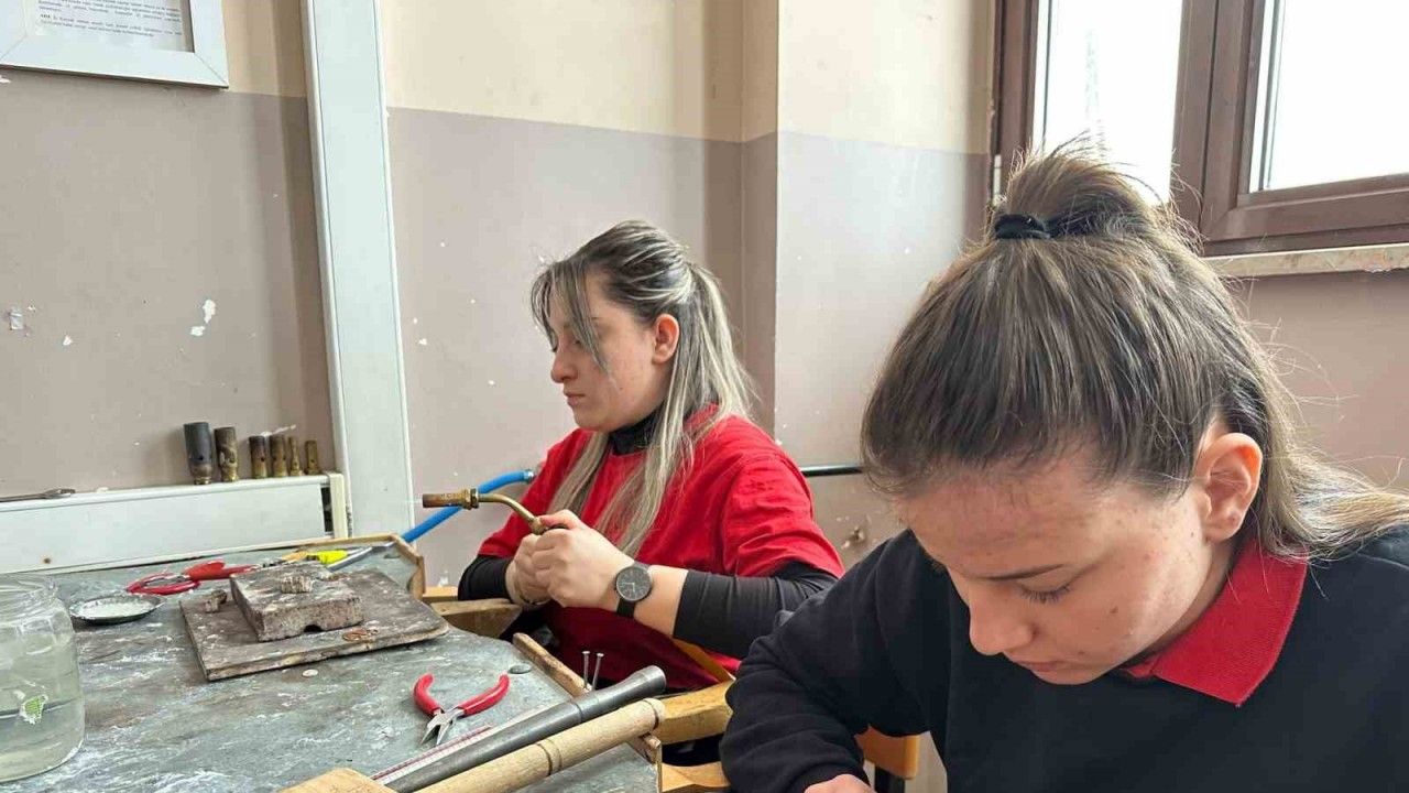 Kayseri’de Ahi Evran Mesleki ve Teknik Anadolu Lisesi Kuyumculuk Teknolojisi bölümünde okuyan kız öğrenciler, ilgi duydukları takıları kendileri şekillendirerek kuyumculuk mesleğine ilerliyor.